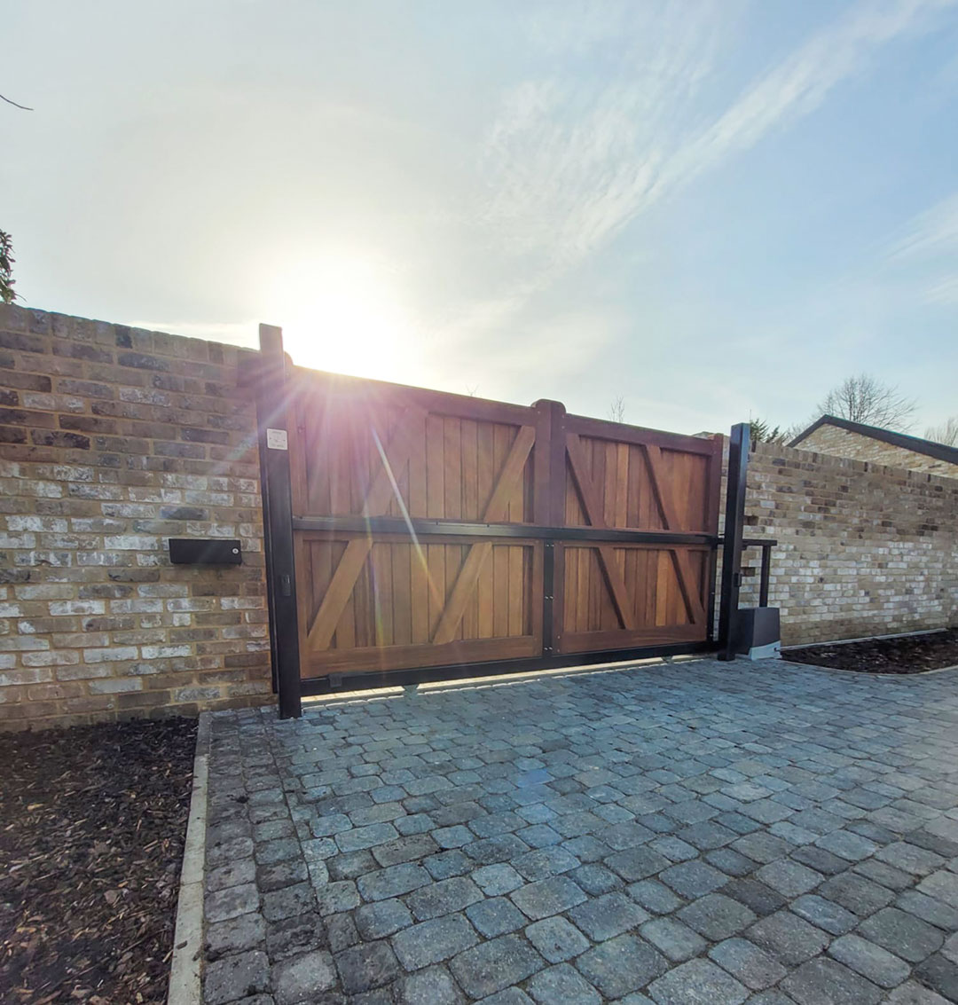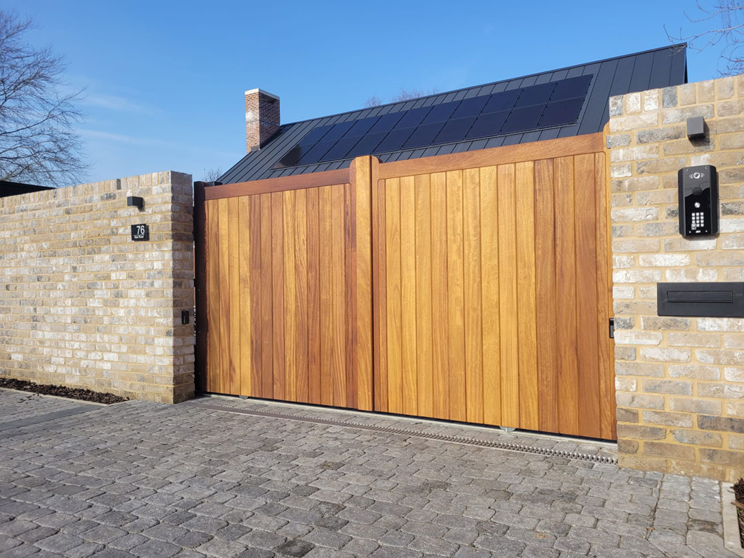 Automatic Sliding Hadleigh Design Gates. Iroko Hardwood