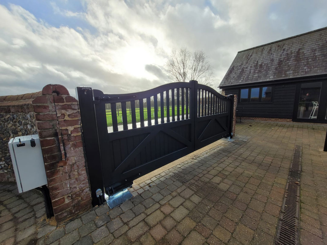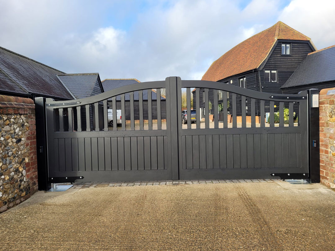 Iroko Newmarket design gates, finished in black Bedec Barn Paint for a clean, durable look that suits the property perfectly.