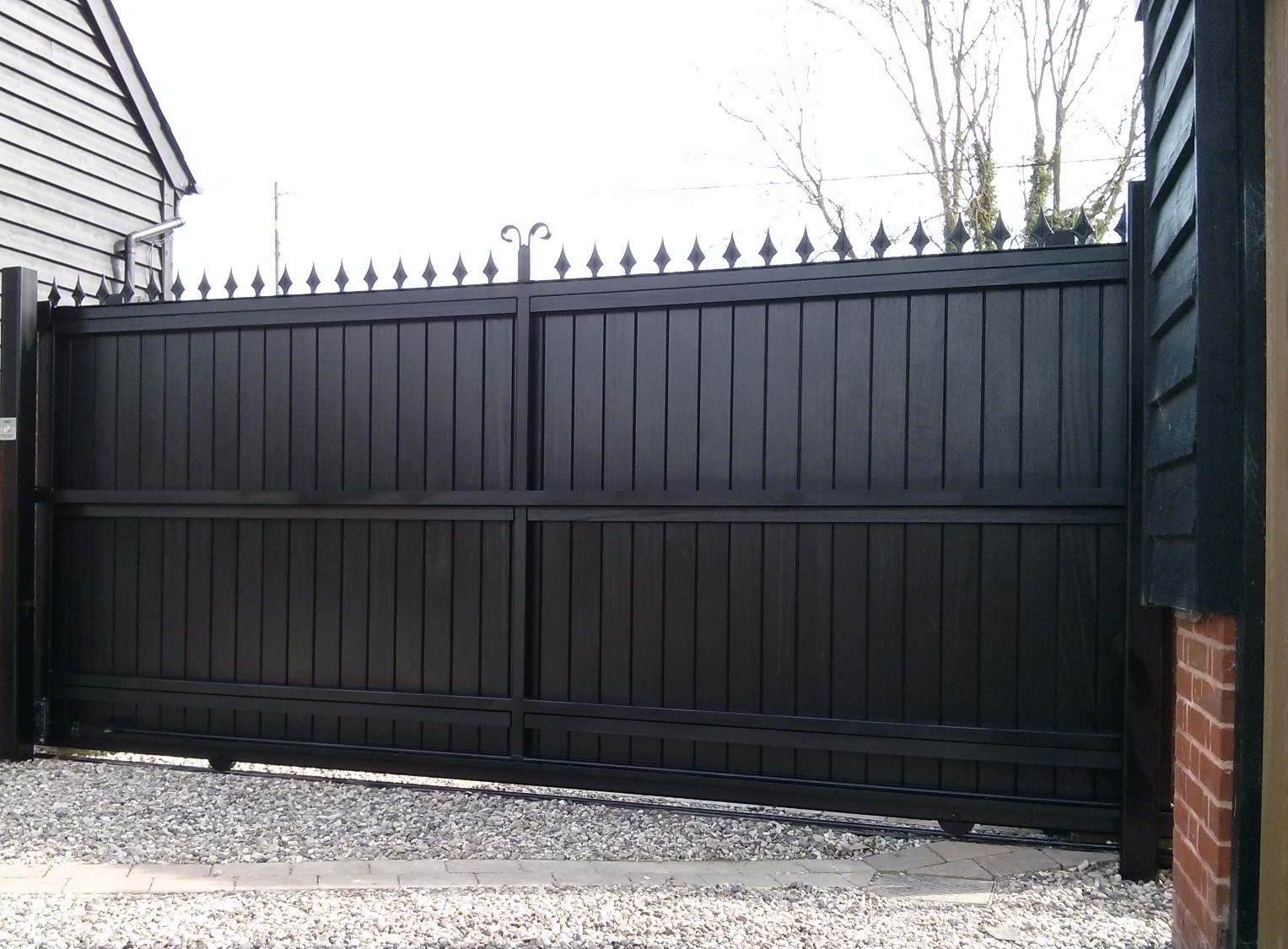 Automatic Steel Framed Sliding Gate With Iroko Hardwood Cladding. Galvanised and painted finish.
